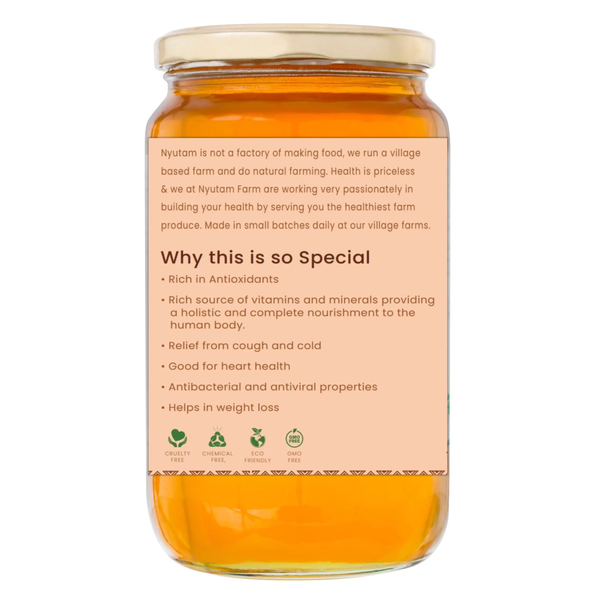 Nyutam Farm Wild Raw Honey is a natural and pure honey that is sourced from the forests and wildflowers of the Himachal Pradesh forest area. Here are some USPs of our Nyutam farm wild raw honey: